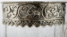 Boccale in vetro riccamente ornato da isnerti in metallo argentato, XX secolo, altezza cm 18,5, (difetti e sbeccature)