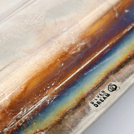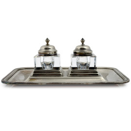 Calamaio in metallo completo di due portainchiostro in vetro e metallo e tagliacarte, XX secolo, cm 9x24x17