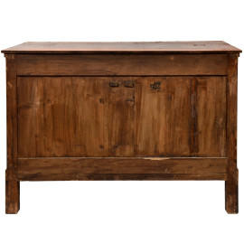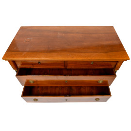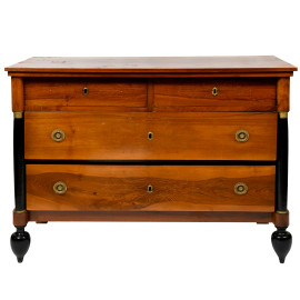 Comò stile impero in noce con rifiniture in bosso, fronte a quattro cassetti con inserti bronzei, fiancheggiati da colonnine laccate nere , XIX secolo, cm 100,5x134x64,5, (difetti)