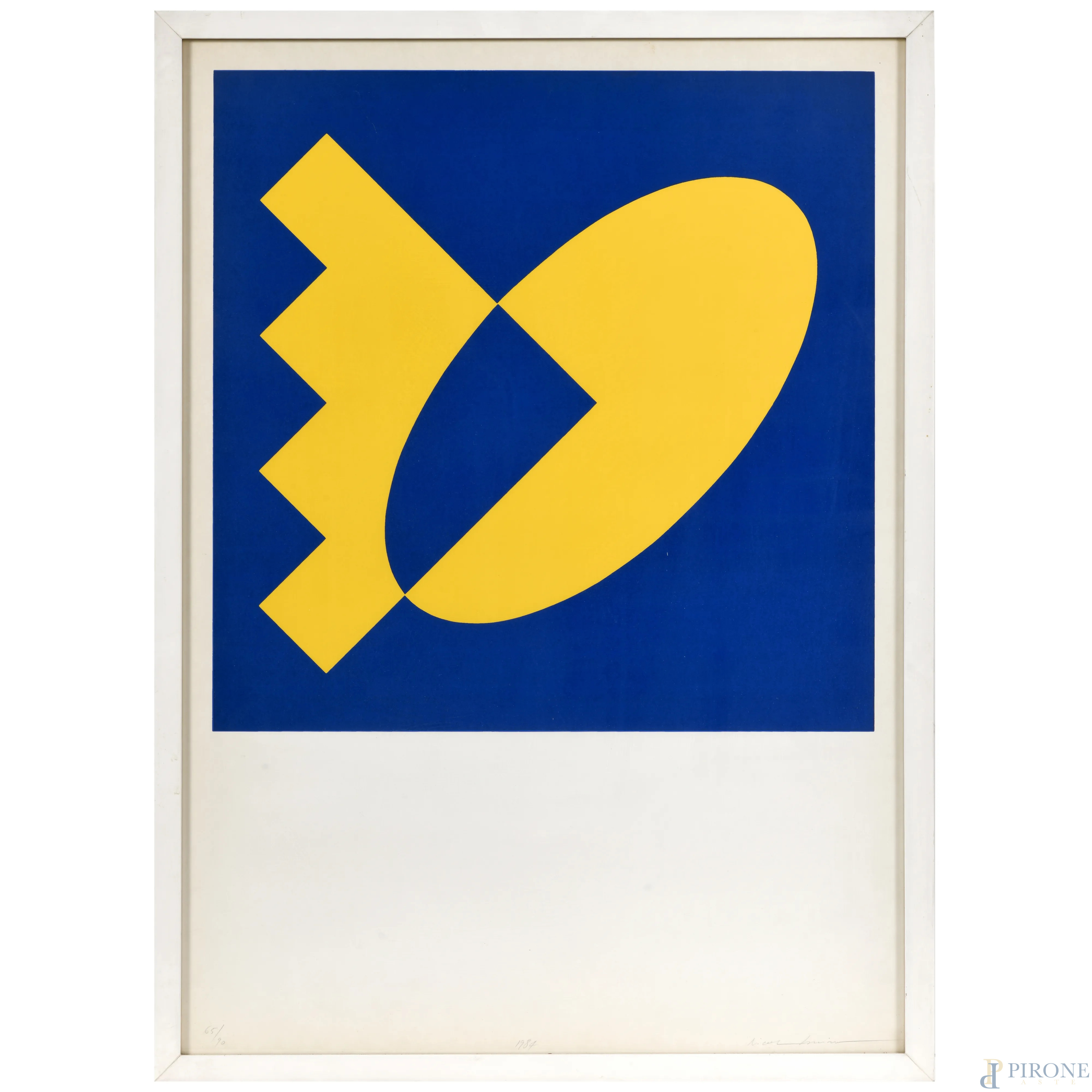 Composizione, litografia a colori, esemplare 65/90, datata 1984 in basso, firmato in basso a destra a grafite, cm 70x50, entro cornice