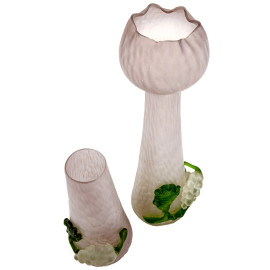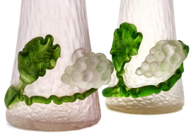 Coppia di vasi in vetro satinato con elementi decorativi a rilievo di grappoli d'uva, XX secolo, altezza massima cm 35