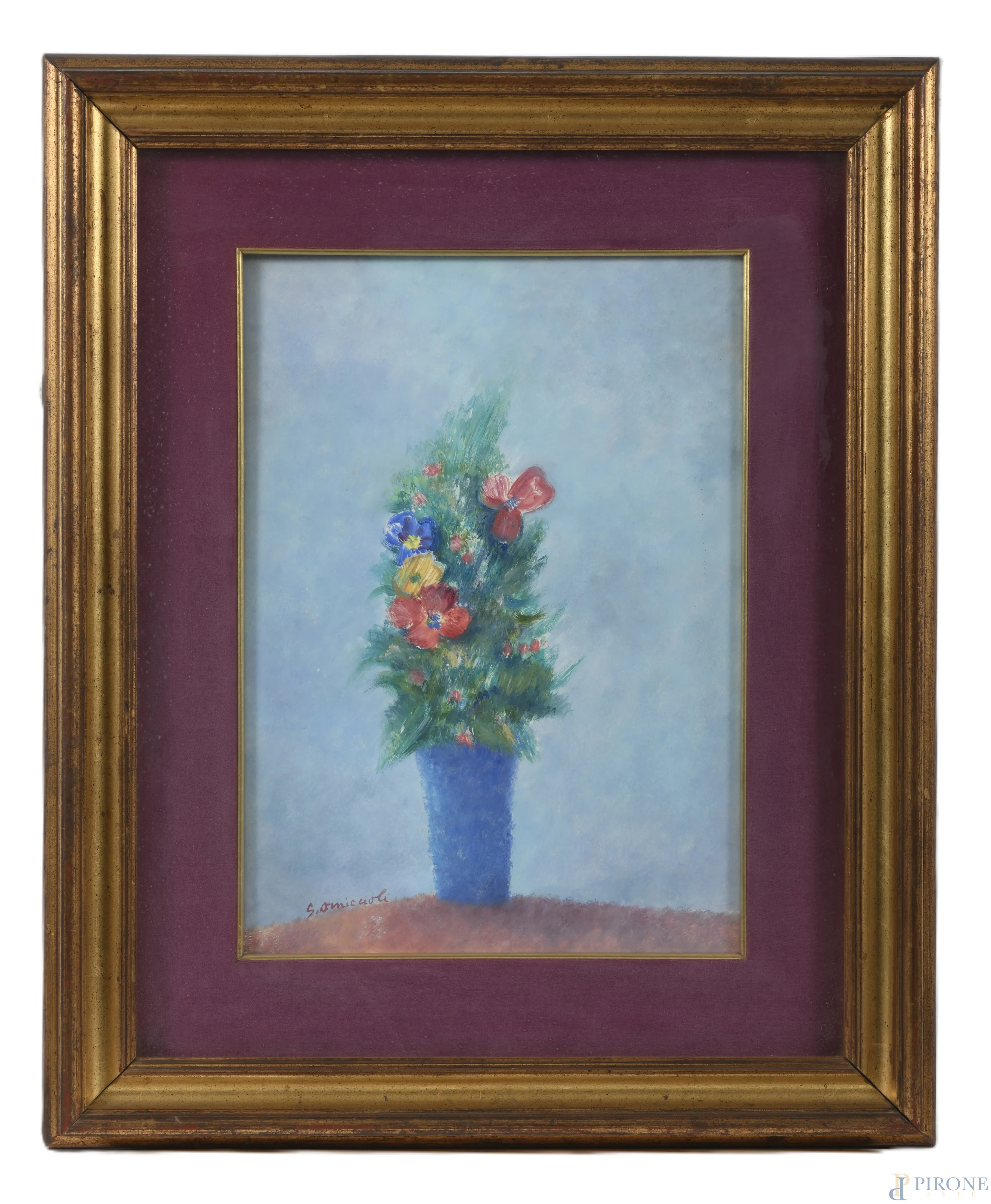 Fiori nel vaso bleu, olio su compensato, cm 51x36, firmato in basso a sinistra, entro cornice