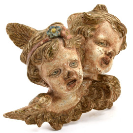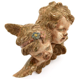 Gruppo raffigurante testa di putti in legno policromo, XX secolo, cm 22,5x30, (difetti)