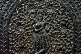 Lotto composto da quattro sedie in stile coloniale in legno ebanizzato, intagliato a motivi geometrici e vegetali, figure di musici sullo schienale, sedute rivestite in tessuto rosso, gambe anteriori a foggia di fiere, sec. XIX, cm 120x44x43,5. (Difetti)