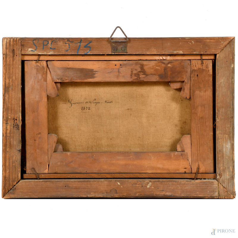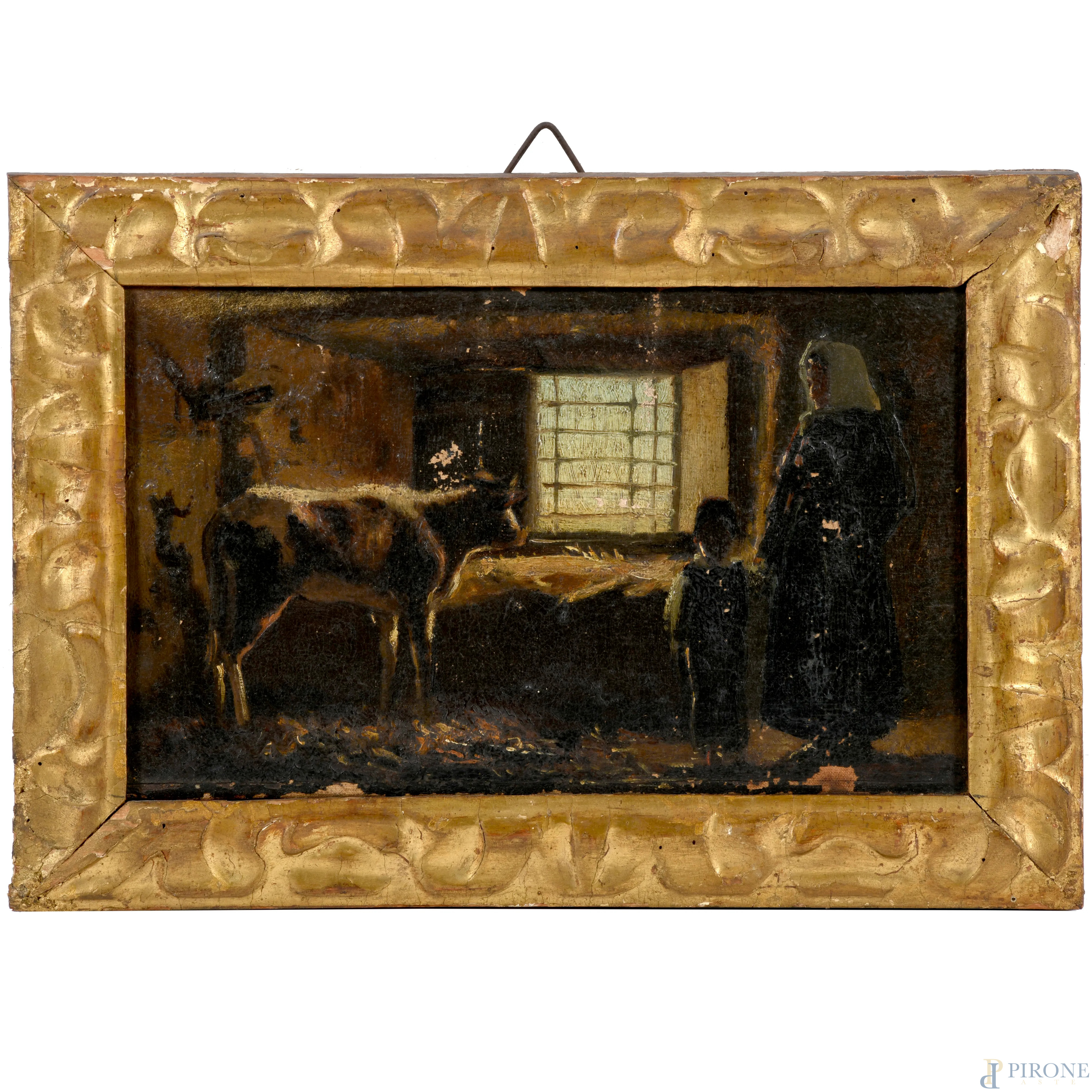 Nella stalla, XIX secolo, olio su tela, cm 18x29,5, firmato e datato "Fondi 1872" al retro, entro cornice, (cadute di colore e sollevamenti della materia pittorica)