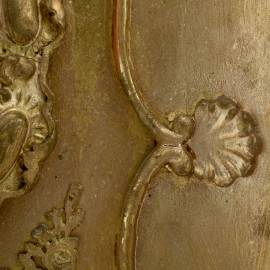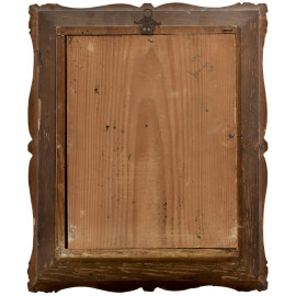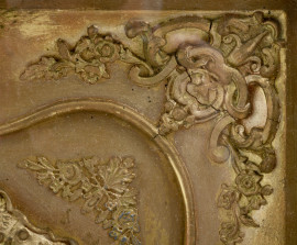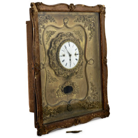 Orologio da muro con cassa in legno dorato riccamente decorata a rilievo a motivi vegetali. Quadrante a smalto con numeri romani, XIX secolo, cm 48x40x13, (da revisionare)