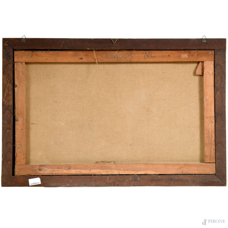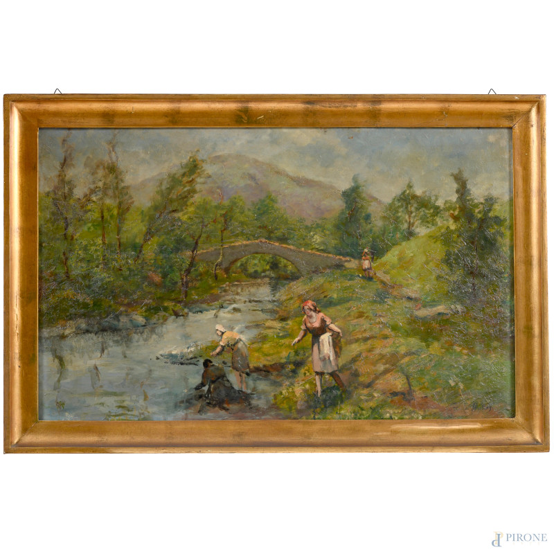 Paesaggio fluviale con figure, XX secolo, olio su tela, cm 62x100, firmato in basso a destra, entro cornice
