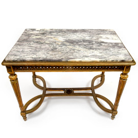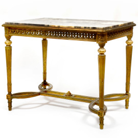 Composto da un divano (cm 106x126x54), due poltroncine (cm 101x61,5x51,5), quattro sedie (cm 98,5x51x47,5) e un tavolo con piano in marmo (80,5x99x65,5)