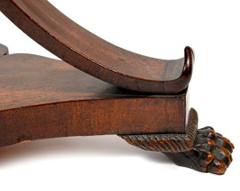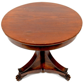 Tavolo circolare impiallacciato in noce con fusto diramato a triplice arco raccordato da pedana sorretta da piedi ferini, XX secolo, cm 80x32,5, (difetti)