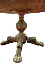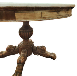 Tavolo tondo in legno con piano circolare in marmo poggiante su fusto in legno tornito terminante i quattro gambe leonine, cm 76,5x118,5 XIX secolo, (difetti)
