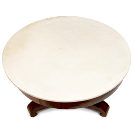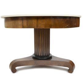 Tavolo tondo in noce con piano in marmo, fusto a colonna scanalata poggiante su base con tre estemità a ricciolo, XIX secolo, altezza cm 79, diametro cm 119, (usura del tempo)
