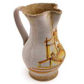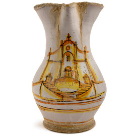 Versatoio in terracotta smaltata e dipinta a fondo bianco raffigurante chiesa, XX secolo, iscritto "A. Madonna Cerreto", altezza cm 26,5, (difetti di cottura, cadute di smalto stannifero),
