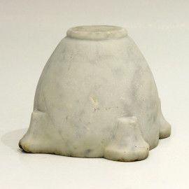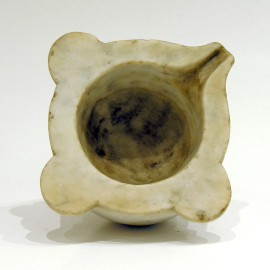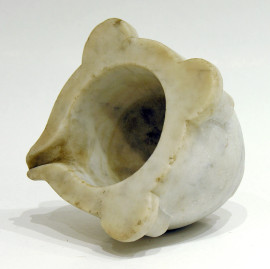 Antico mortaio in marmo di Carrara, raro modello con modanature a capitello e sversatoio, larghezza massima cm 16, altezza cm 11