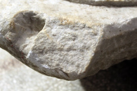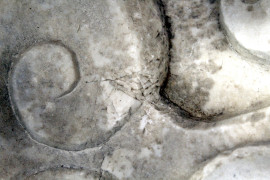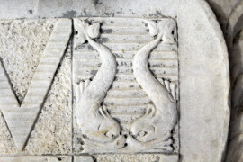 Antico stemma araldico in marmo bianco, raffigurante delfini affrontati e scaglioni rovesciati, cornice a volute, corona alla sommità, cm h 76x60x15