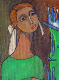 Artista post-cubista del Novecento, Fanciulla con figura astratta, olio su faesite, cm 51x33, siglato in basso a destra
