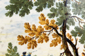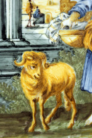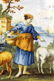 Attr. a Francesco Saverio Grue (Castelli,1731 - Napoli, 1800), mattonella in maiolica dipinta in policromia raffigurante paesaggio con figure e caprette, cm 20x26x2, (difetti)