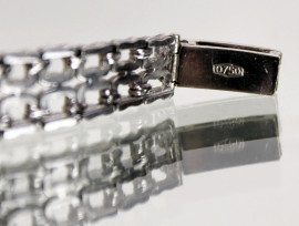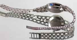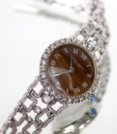 Baume & Mercier Geneve, orologio in oro bianco 18kt con diamantini, quadrante occhio di tigre a numeri romani, lunghezza cm 19, (meccanismo da revisionare)