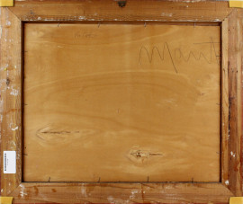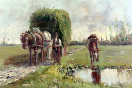 Carro con fieno e figura, olio su compensato, cm 40x50, firmato Guido Mantovani, entro cornice