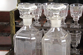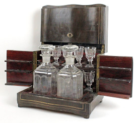 Cave a Liqueur in noce con filettature in bronzo, completo di due bottiglie e nove bicchierini in vetro, XIX secolo, cm h 23x26x18,5, (difetti e mancanze)