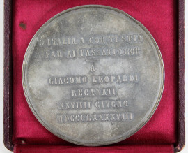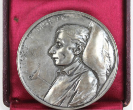 Centenario della nascita di Giacomo Leopardi, medaglia in bronzo argentato, 1898, autori Luigi Giorgi e Augusto Passaglia, diam. cm 7,5