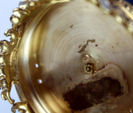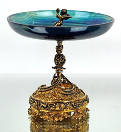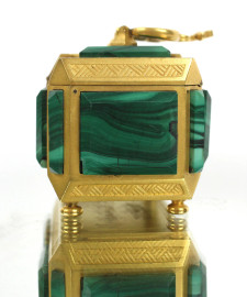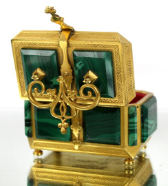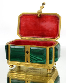 Cofanetto in bronzo e malachite, inizio XX secolo, decori incisi, presa a intreccio di volute vegetali, cm 11x10x6