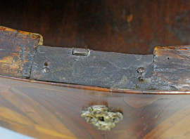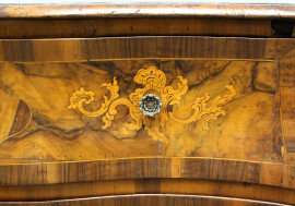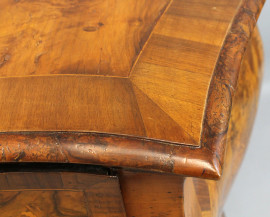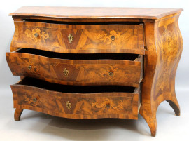 Comò stile Luigi XV, in noce e radica di noce, fronte e fianchi mossi, tre cassetti filettati e intarsiati, pomelli e bocchette in bronzo dorato, cm h 97x152x62