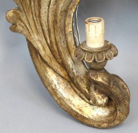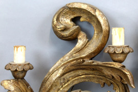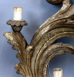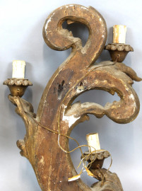 Coppia di appliques a tre luci in legno intagliato e dorato, fine XIX secolo, cm h 61x40x15