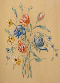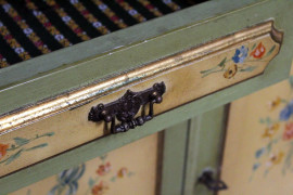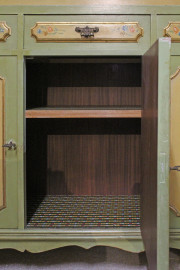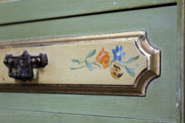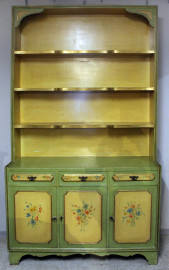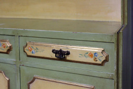 Coppia di librerie in legno laccato verde e giallo, a tre ripiani, tre cassetti e tre sportelli pannellati con decori a mazzetti di fiori, particolari dorati, misure cm h 247x137x41 cadauna