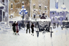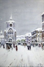 Coppia di paesaggi innevati, acquarelli su carta, cm 37x30, firmati, entro cornici