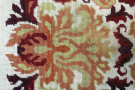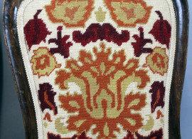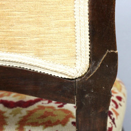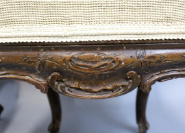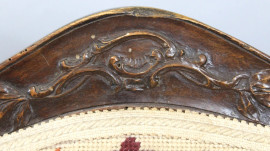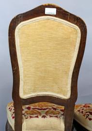 Coppia di sedie francesi del XVIII secolo, in noce intagliato, schienali e sedute imbottiti e rivestiti in tessuto ricamato, altezza cm 109,5, (segni del tempo)