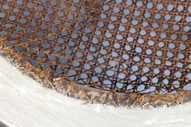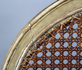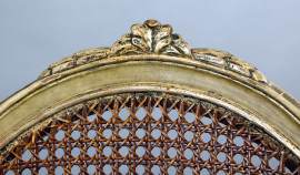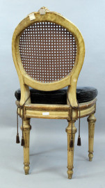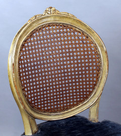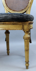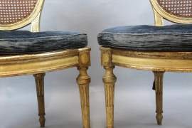 Coppia di sedie in legno laccato e dorato, sedute e schienali in cannetè, gambe rastremate e scanalate, cuscini in velluto blu, (difetti)