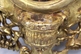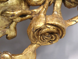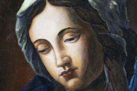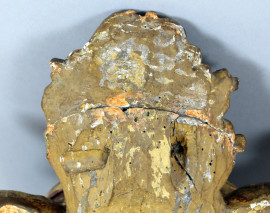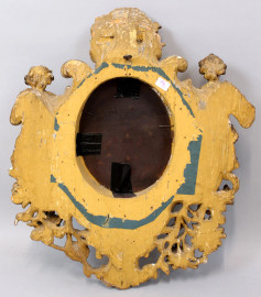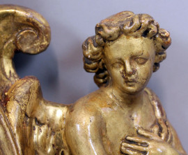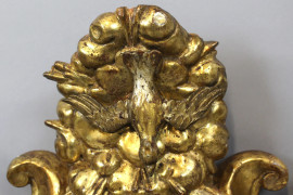 Cornice in legno dorato, inizi XVIII secolo, scolpita a due figure di angeli laterali e colomba dello Spirito Santo sulla sommità, acquasantiera nella parte inferiore. All'interno dipinto ad olio su rame raffigurante la Vergine in preghiera (copia dall'antico), cm 63x50x13