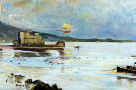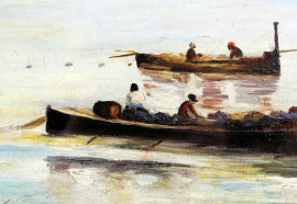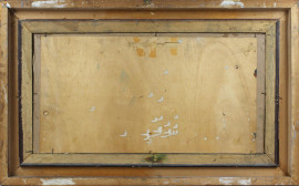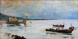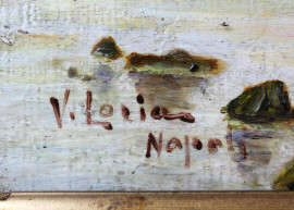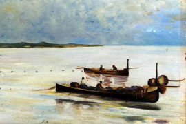 Costa con imbarcazioni, olio su tavola, cm 25,5x49, firmato, entro cornice