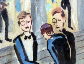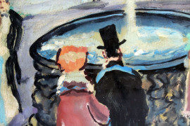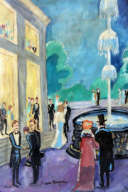 Esterno di villa con fontana, olio su cartone, cm 64x49, firmato, entro cornice