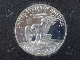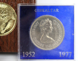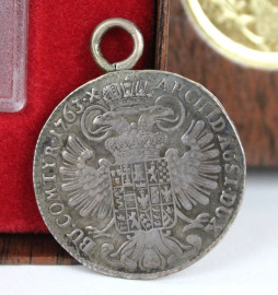 Lotto composto da: 1 dollaro Stati Uniti 1972, una serie di monete Israele 1975, 25 Pence Regina Elisabetta II 1952-1977, ½ tallero Austria 1763 a ciondolo
