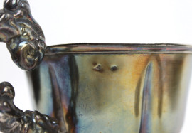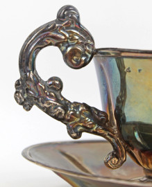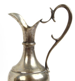 Lotto composto da una tazzina con piattino ed un piccolo versatoio in argento, altezza max cm 19, gr. 270, (difetti)