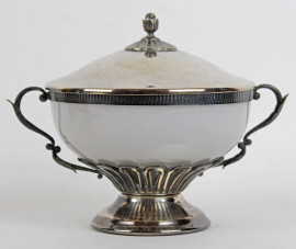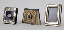 Lotto composto da una zuccheriera in metallo argentato e opalina, due cornicette ed un'agendina in argento, alt. max cm 13, XX secolo