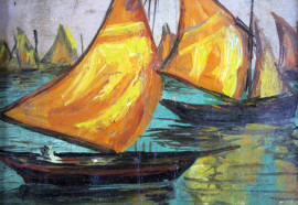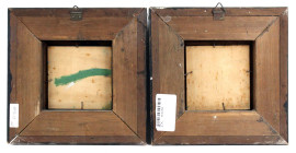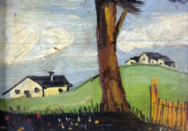 Lotto di due dipinti raffiguranti marina con imbarcazioni e paesaggio con albero e case, olio su compensato, cm 10x10, XX secolo, entro cornici