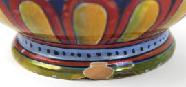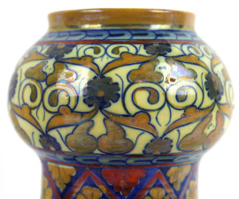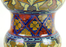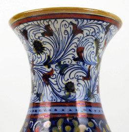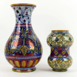 Lotto di due vasetti in ceramica a lustro, dipinti con motivi vegetali e floreali nei toni del blu, rosso ed ocra, altezza max cm 25, (difetti)