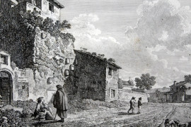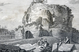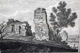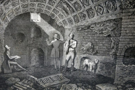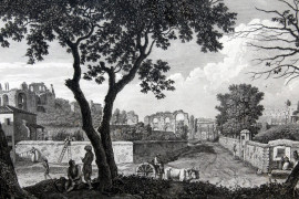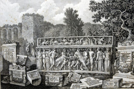 Lotto di sei incisioni da "La Via Appia Illustrata" di Carlo Labruzzi (1748-1817), cm 46,5x65,5, entro cornici, (difetti, macchie)