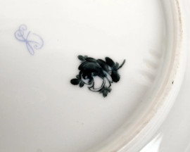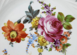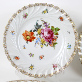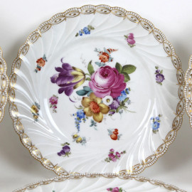 Lotto di sei piatti in porcellana Dresda a decoro di fiori con bordo dorato, diametro cm 22, (difetti)