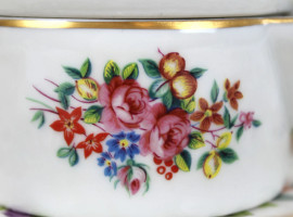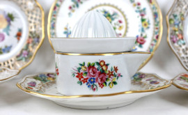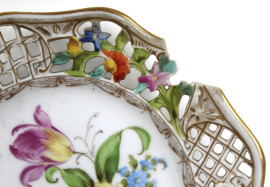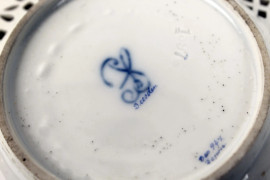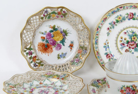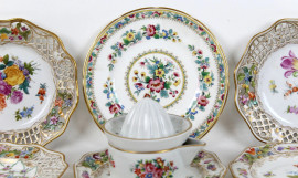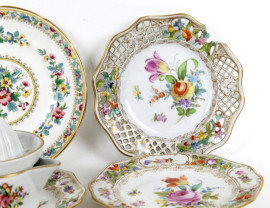 Lotto di sei piattini ed uno spremiagrumi in porcellana, diverse manifatture, diametro max cm 17,5, (difetti)