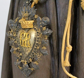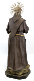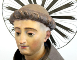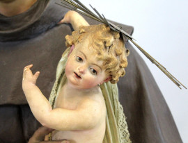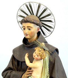 Sant'Antonio con il Bambinello, scultura in cartapesta dipinta, firmato e datato alla base, alt. cm 126, (difetti alle dita del Bambinello)