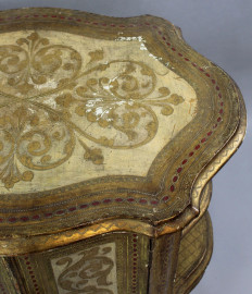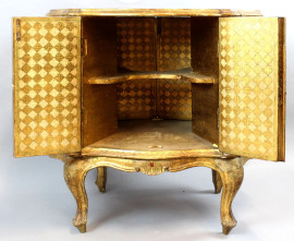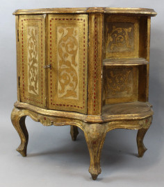 Mobilino da centro in legno dorato e dipinto, piano modanato mistilineo, fronte e fianchi mossi a quattro sportelli e vani a giorno, piedi a ricciolo, decori incisi, cm h 70x51x73, XX secolo, (difetti)