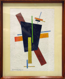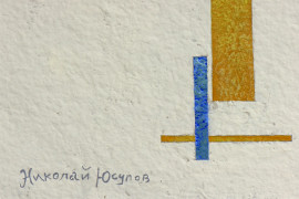 Nikolay Yusupov (XX sec.), Composizione suprematista, tempera su cartone, cm 36x25, firmato in caratteri cirillici in basso a sinistra, con cornice