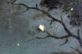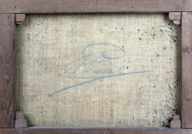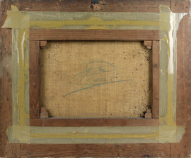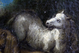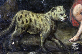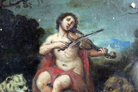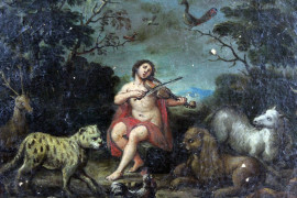 Orfeo incanta gli animali, antico dipinto ad olio su tela, cm 34x43, entro cornice, (piccole cadute di colore)