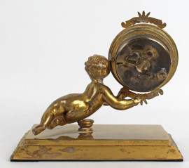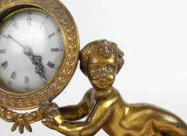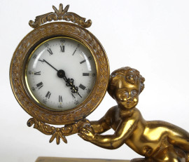 Orologio da tavolo in bronzo dorato, con putto che sorregge quadrante circolare a numeri romani, meccanismo al quarzo, cm 15x17x9, (funzionante, segni del tempo)