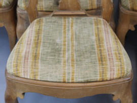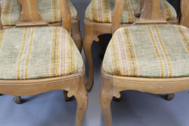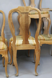 Otto sedie in stile Chippendale, struttura in noce, sedute imbottite e rivestite in tessuto vellutato, altezza cm 102, XX secolo