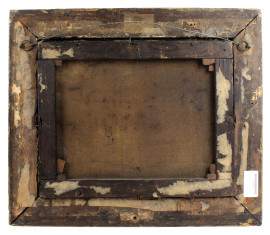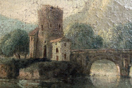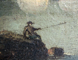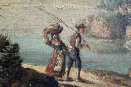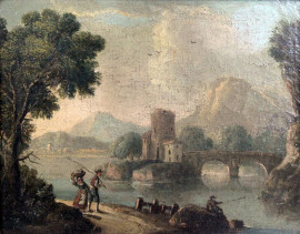 Paesaggio con viandanti e pescatore, olio su tela, cm 33,5x41,5, XIX secolo, entro cornice.