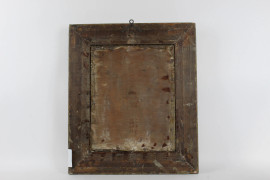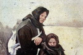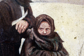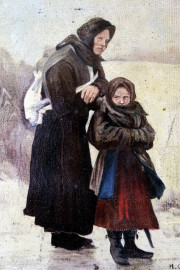 Paesaggio invernale con madre e figlia, olio su tela applicata su tavola, cm 34x27, scuola russa, XX secolo, entro cornice